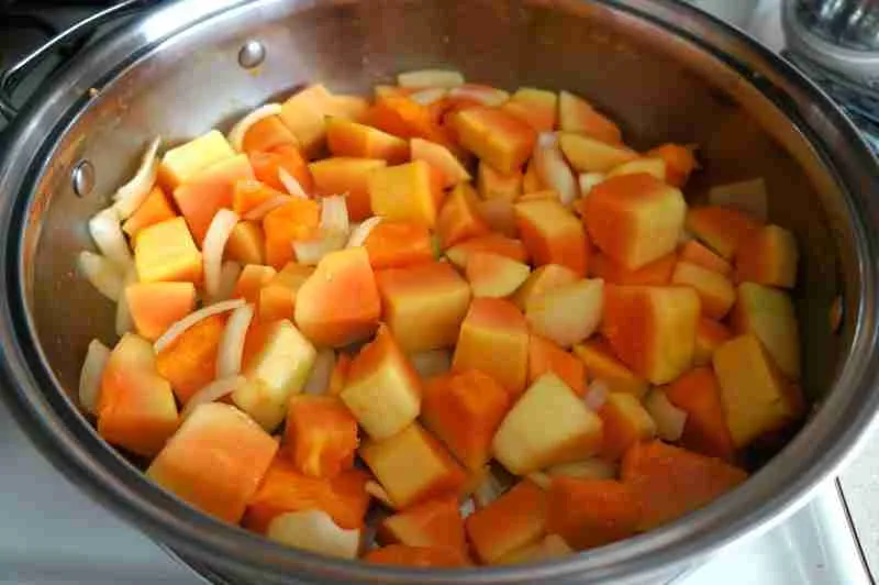 - Simmer the Papaya: Add the cubed papaya and vegetable/chicken stock to the pot. Season with salt and pepper. Bring to a simmer, then reduce heat and cook for 15-20 minutes, or until the papaya is tender.
